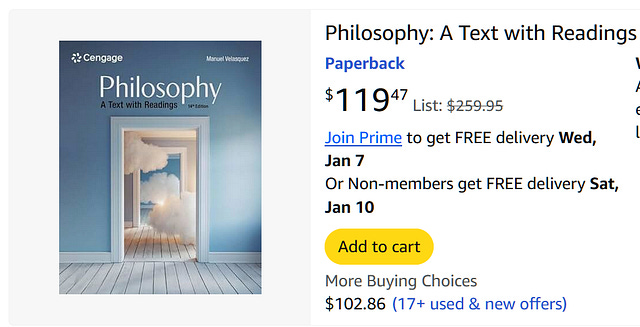 First, let me explain the textbook I have used in my introduction to philosophy courses. College students enter introduction to philosophy courses with little to no prior exposure to philosophy. Most K–12 schools don’t have the courage to teach philosophy. American society has a habit of portraying philosophy as something either boring or weird. The first task in any introductory philosophy course is to overcome the stigma and encourage students to engage with the topic. In case you don’t know, introduction to philosophy fulfills a general distribution requirement, so most students take the course only because it is required. They don’t know what philosophy is, and they are primed to think a philosophy course is, at best, a necessary burden.